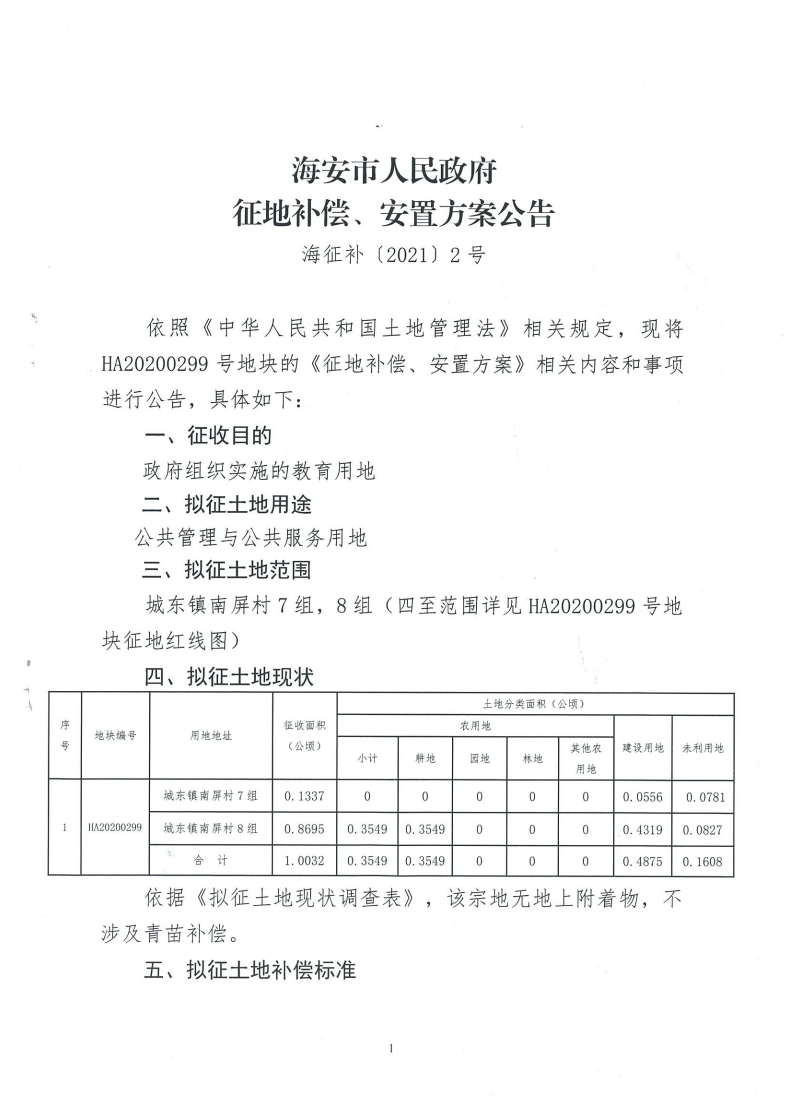 海安市人民政府征地补偿安置方案公告(海征补〔2021〕2号)